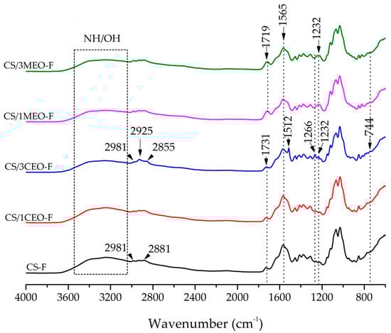 No changes were observed in the FTIR spectrum of chitosan when 1% CEO was added to the film (CS/1CEO-F), showing absorption bands similar to the pure chitosan film spectrum (CS-F). The chitosan film (CS-F) spectrum shows a broad band between 3660 and 3026 cm−1, corresponding to the stretching vibrations of the -OH group, superimposed on the N-H band, indicating intermolecular bond formation. Bands at 2981 and 2881 cm−1 were associated to C–H group asymmetric and symmetric stretching vibrations, respectively []. In addition, they showed characteristic absorption bands at 1731 cm−1, belonging to axial deformation of the C=O group of the chitin, at 1640 cm−1 associated to the amide I group and NH3+ asymmetric deformation, and at 1565 cm−1 related to the amide II group, N–H bending vibration and the NH3+ symmetric deformation. This last band is related the vibrations of the protonated amine group δ (NH3+). From these results, it can be observed that the chitosan was not totally deacetylated and, for this reason, the presence of both acetylated (R–C=O) and deacetylated (-NH) groups are found in the chitosan films under study. In addition, bands in the range from 1405 and 1307 cm−1 were attributed to the methylene and methyl groups, between 1149 and 1029 cm−1, were related to the C–O group stretching from glycosidic bonds and the band at 848 cm−1 represent of the saccharine ring [,,,,].