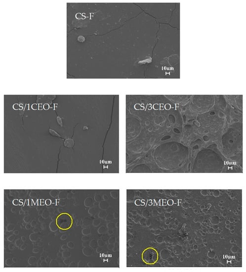 The films CS/1MEO-F and CS/3MEO-F presented morphologies with rough appearance and presence of MEO droplets with varying shapes and sizes, well distributed along the surface of the films. Dark spots marked by yellow circles were observed in the films but are clearer in the SEM images of the CS/1MEO-F. Dark spots may be indicative of oily material deposited in the film. In this work, the dark spots represent the oil that did not solubilize in the polymer solution.