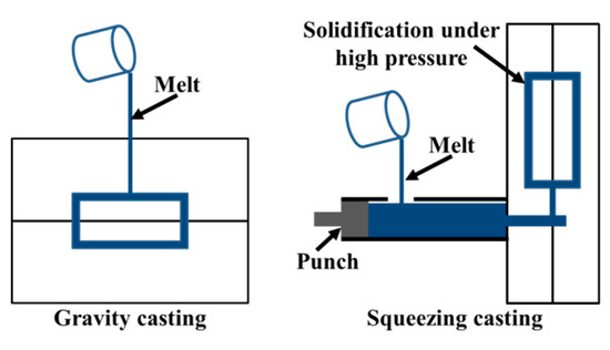 Schematic diagram of gravity casting and squeezing casting.