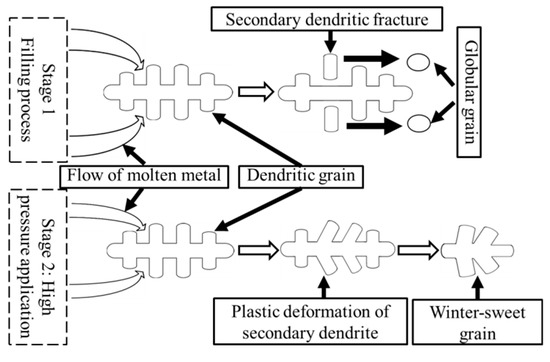 As shown in the upper corner of Figure 2b, the microstructure is composed of the primary α (Al) phases and eutectic composition (α + Si). The primary α (Al) grains of the Al alloy concerned in this work are in spherical, elliptical and petaloid shapes, different from the results obtained by Wang et al. [5] and Ashiri et al. [12], which showed fine dendritic primary α (Al) grains. During the filling process, some dendritic grains formed on the internal surface of the pouring runner and mold. Those dendritic grains would be broken by the intense melt flow resulted from the high filling speed, and the fragments of grains will form the α (Al) phases with the shapes of sphere and short rod. After the filling process, the molten metal containing a certain proportion of solid phase in the mold was immediately applied with a high pressure of 135 MPa. During the subsequent solidification process, a significant volume contraction of the alloy can be caused by the combination of the application of high pressure and the contraction of the alloy. With the application of high pressure, the punch moved forward to promote the further flow of the residual molten metal and activate new feeding mechanisms. The plastic deformation of the secondary dendrite arms could be caused by the re-mobility of the residual molten metal, and lead to the formation of the winter-sweet grains. Figure 3 illustrates the fragmentation process and the plastic deformation process of the primary α phase.