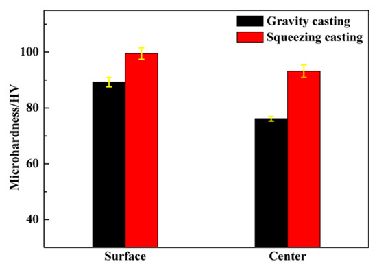 Generally, there is a difference in micro-hardness between the center and surface of the cast alloy. The surface layer of the cast alloy is transformed from a solid shell with a faster cooling rate than the center. Therefore, the surface layer can achieve a smaller grain size and higher element content in the α (Al) matrix, resulting in higher microhardness of the surface layer than the cast center. In addition, Figure 4 indicates that the difference of the hardness values between the surface and the center of the casting parts is narrowed from 13.4 HV (gravity casting) to 6.2 HV (squeezing casting). As explained above, the application of high pressure during squeezing casting can help increase the cooling rate and remove the blow holes and the shrinkage porosity, which are mainly distributed inside the cast. This will cause the increase of hardness inside the cast, but has little effect on the hardness of the surface layer, reducing the micro-hardness gap between the central part and the surface layer of the cast. Therefore, squeezing casting makes the material more uniform.