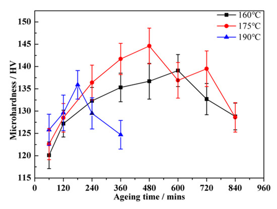 As a typical ageing hardenable alloy, the mechanical properties of the alloy mainly depend on the type, size and density of the precipitates that form in the ageing treatment. The supersaturated solid solution (SSSS) formed through solution treatment provides good conditions for precipitate formation during the subsequent ageing process. The ageing treatment following the solution treatment can result in the formation of precipitates and the increase of the mechanical performance of the alloy. In the present work, the ageing treatment was performed at target temperatures of 160 °C, 175 °C and 190 °C for different periods of time ranging from 60 min to 840 min. The micro-hardness of the α (Al) matrix in the Al alloy was measured corresponding to different ageing treatments. Figure 8 shows that the micro-hardness of specimens increases rapidly at the early stage of the ageing treatment. With the extension of the ageing time, the increase rate declines and the peak ageing time corresponding to the maximum micro-hardness value was obtained for each ageing temperature. When the holding time is longer than the peak ageing time, the micro-hardness of the alloy decreases due to the over-ageing effect. It can be found that the peak ageing time decreases with the increase of the ageing temperature and the highest peak ageing micro-hardness value (144.6 HV) was obtained in the sample subjected to ageing treatment at 175 °C for 480 min.