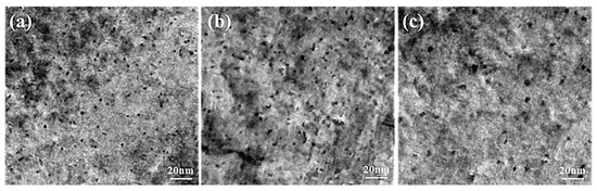 Figure 9 displays the TEM images of sample peaks aged at 160 °C for 600 min, 175 °C for 480 min and 190 °C for 180 min. The high-resolution transmission electron microscopy (HRTEM) images corresponding to Figure 9, taken from [001] Al zone axes, are presented in Figure 10. It can be seen that dense and fine precipitates distribute uniformly in the α (Al) matrix after ageing at 160 °C for 600 min, as shown in Figure 9a. The majority of precipitates in this sample were coherent with the α (Al) matrix (Figure 10a). The sample aged at 175 °C for 480 min (Figure 9b) possesses slightly larger precipitates and similar number density in the α (Al) matrix, compared with that observed in Figure 9a. However, Figure 10b indicates that most of the precipitates become semi-coherent with the matrix. The coarse precipitates with low number density were distributed in the α (Al) matrix when the sample experienced ageing at 190 °C for 180 min (Figure 9c). Meanwhile, those precipitates become incoherent with the matrix (Figure 10c). In this work, the β phases (Mg2Si) are replaced entirely by the Q phases (Al5Mg8Cu2Si6) since the ratio of Cu/Mg (2.57) is larger than 2.1 [27]. Therefore, the precipitates induced by ageing treatment are composed of GP zones (Guinier Preston zone), the metastable phases of Q phases (Al5Mg8Cu2Si6) and θ phases (Al2Cu). The precipitation sequence can be summarized as follows: SSSS → solute clusters → solute clusters + GP zones → metastable precipitates (Q’ phase and θ’ phase) → equilibrium precipitates (Q phase and θ phase). The GP zones can be regarded as the metastable precipitates in a coherent relation to the α (Al) matrix. During the ageing treatment, Cu atoms dissolved in the α (Al) matrix combine with Mg, Si, and Al atoms to transfer into the Q’ phases in a semi-coherent relation to the α (Al) matrix. The remaining Cu atoms combine with Al to form θ’ phases in a semi-coherent relation to the α (Al) matrix. With the increase of ageing time, metastable precipitates (Q’ phase and θ’ phase) can transfer to equilibrium precipitates (Q phase and θ phase) in an incoherent relation to the α (Al) matrix.