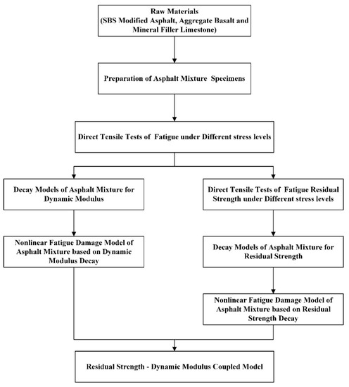Figure 1. This research presents direct tensile fatigue test and fatigue residual test of asphalt mixtures at different stress levels. The non-linear fatigue damage models of asphalt mixtures with dynamic modulus decay and residual strength decay as damage variables were established based on the dynamic modulus decay model and residual strength decay model, respectively. Under the assumption that the residual strength and dynamic modulus at the same time depend on the same damage state inside the material, the coupled relationship between the residual strength and dynamic modulus was given, and the coupled model of residual strength and dynamic modulus was established. The paper proposes a modified formula for calculating the damage variables associated with residual strength and dynamic modulus based on the relationship between two kinds of damage variables.