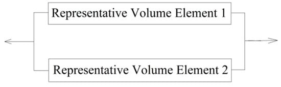 To calculate the statistical characteristics of CFRP considering the size effect, a series-parallel model based on the weakest-link model and the chain-of-bundles model is proposed here. In the series-parallel system, which is commonly used for the modeling of bridge structures, all of the elements in the system were considered as plastic components; e.g., the elements could bear the load within the scope of their ultimate capacity as the load exceeds their strength. Taking a simple parallel system as an example (as shown in Figure 3), we assumed the elements to be plastic components and be mutually independent. The system failure probability could be expressed by the failure probability of the two elements, as shown in Equation (2).