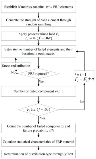 Flow chart of the numerical simulation process for determining the statistical characteristics of the CFRP strength considering the size effect.