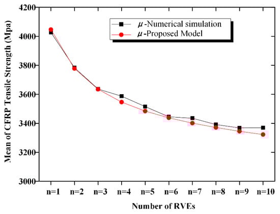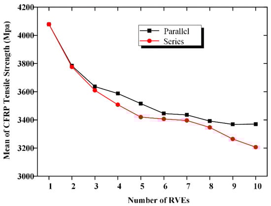 A numerical simulation method is used in this study to analyze the strength of CFRP fabric as a m × n series–parallel system, according to the failure criterion described above. Figure 6 shows the mean of the CFRP tensile strength along with an increase in m and n. Figure 7 displays the curved surface to represent the relationship between the mean CFRP tensile strength and the dimensions of the CFRP material. We observe from the figures that the mean CFRP strength decreased with an increase in the number of elements. For CFRP specimen with 10 serial or parallel RVEs, the mean values of the strength were 21% and 16% lower than those of the RVE. For the 10 × 10 series–parallel system, the reduction of strength due to the size effect is close to 40%.