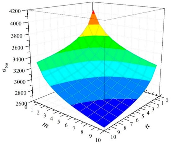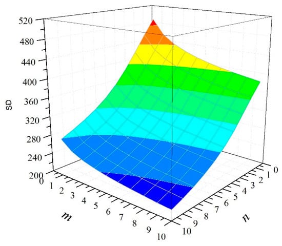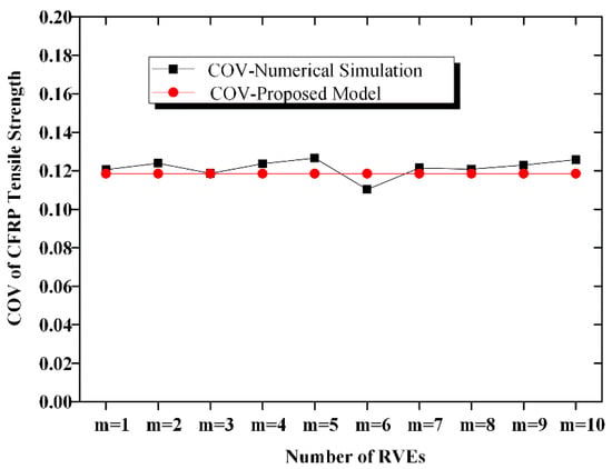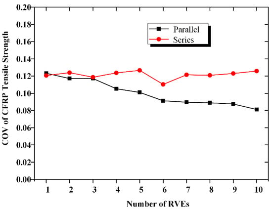 Figure 8 shows the relationship between COV of the CFRP tensile strength and the number of RVEs. With an increase in n, for the n-element parallel system, the COV of the CFRP strength decreases slightly. In contrast, for the m-element series system, COV remains almost the same with an increase in n. We thus conclude that the uncertainties related to CFRP decrease with an increase in the fabric width. Figure 9 presents the relationship between the standard deviation (SD) of the CFRP strength and the size of the CFRP material. We observe from the curve surface that the SD of the CFRP strength decreases with both the number of series elements and the number of parallel elements.