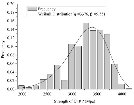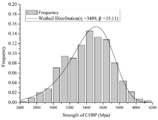 To determine the distribution type of the CFRP strength, a chi-square test was conducted using the data obtained through the numerical simulation. Four types of commonly used distributions, namely normal distribution, log-normal distribution, Weibull’s distribution, and gamma distribution, are considered in the test. The results of the chi-square test are presented in Table 2. In the table, the first two columns present the number of RVEs. The third column shows the threshold value of the chi-square test with an assurance rate of 99.5%. In the last four columns, the test results are presented and the minimum values are marked in boldface. These results showed that the CFRP strength obeyed the Weibull distribution, which is in accordance with the experimental results obtained by Zhou et al. [].