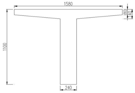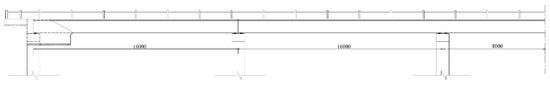 The span length of the case bridge is 16 m, and the total length of the bridge is 80.62 m. The width of the bridge is 13.5 m and eight reinforced concrete T beams are arranged paralleled in a single span. The nominal strength of the concrete used in the bridge is 30 MPa. The area of tensile rebar reinforcement is 4926 mm2, and the nominal strength of the rebar is 345 MPa. The design load was a superposition of the traditional HS20 truck and lane loading. The side elevation of the bridge and the cross section of the internal beam are shown in Figure 16 and Figure 17.