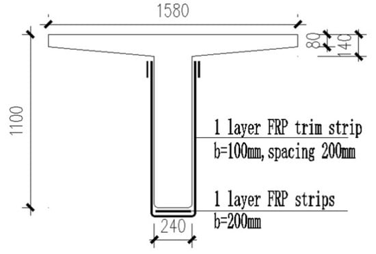 In 2011, a regular inspection was conducted on the considered bridge. The condition of the bridge was classified as Condition State IV, implying that rehabilitation was needed according to Code for Maintenance of Highway Bridges and Culvers []. In this study, the strengthening of the existing bridge is designed on the basis of the Specifications for Strengthening Design of Highway Bridges. The resistance of the strengthened girders is calculated using a sectional analysis. There are five common failure modes for the FRP-strengthened concrete beam [,].