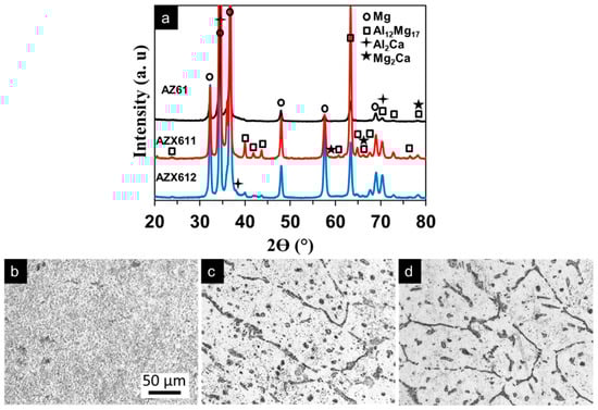 (a) X-ray diffraction pattern and surface microstructure of (b) AZ61, (c) AZX611, and (d) AZX612 alloys. The scale bar in image (b) applied to images (c) and (d).