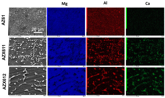 Figure 2 shows the SEM images and the corresponding EDS maps for the elements Mg, Al, and Ca, showing the element composition of the three alloys. In the maps, blue represents Mg, red represents Al, and the green represents Ca. The AZ61 alloy shows a high density of precipitates on its surface. The maps displayed a nearly uniform blue and red maps corresponded to the β precipitate smeared in the matrix. The size of precipitates became larger with increasing Ca content in the alloys, and the matrix became clearer from precipitates. The maps for AZX611 and AZX612 showed that the intermetallic consisted of Mg, Al, and Ca. This analysis proved the unambiguous presence of Al2Ca and Mg2Ca precipitates besides the β phase in both AZX611 and AZX612 alloys. The amount of Al2Ca phase dominated over Mg2Ca phase.
