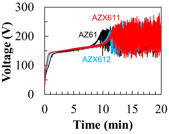 Voltage–time curves during 20 min anodization of AZ61, AZX611, and AZX612 alloys in 0.5 M Na3PO4 solution at 25 °C.