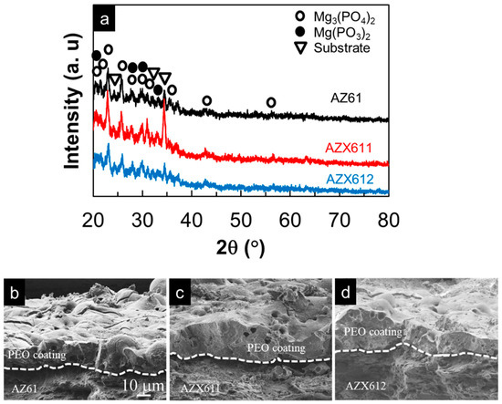 Figure 4 displays the XRD pattern of the resulting coatings formed on the three alloys and the cross-sectional FE-SEM images of the coatings. Most of the peaks for substrates no longer appeared in the XRD pattern of the coated specimens indicating an excellent blocking effect of the coatings from the X-ray. The composition of the coatings formed on the three alloys were similar, which were composed of both crystalline and amorphous phases as shown by the appearance of the broad peak between 20° and 40°, which attributed to the amorphous phase, and the small peaks inside the broad peak corresponded to the crystalline oxide phases of Mg3(PO4)2 and Mg(PO3)2. The coatings that formed on all of the specimens exhibited a similar uneven structure, as shown in Figure 4b–d. Pores and cracks, which are the footprint of PEO coating, were observed on both the surface and inner part of the coating. Fine cracks were developed during the PEO process, while heavy cracks occurred unintentionally during specimen preparation. The coating formed on Ca-containing alloys was slightly thicker than that of the base alloy. In agreement with the cross-section images, the average coating thickness measured by coating thickness gauge were 25, 32, and 30 µm for the coating formed on AZ61, AZX611, and AZX612, respectively. The XRD analysis did not detect the presence of Ca in the coating, similar to the earlier result on AM60 [23]. The Ca compounds may have been present in an amorphous state.