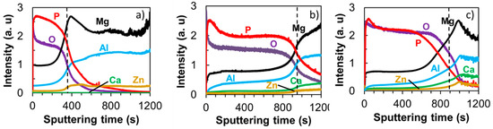 The coatings composition was further analyzed by depth profile GDOES, and the results are displayed in Figure 5. The dashed line marks the coating–metal interface at which the O and Mg profiles crossed each other. All of the coatings were composed of Mg, P, O, and Al. Confirming XRD results, the primary oxide phases in the coatings consisted of Mg–O compounds. The GDOES profile suggested the presence of other oxide phases, including MgO and Al2O3 in the amorphous state. The incorporation of Ca in the coating of AZX611 and AZX612 alloys was confirmed by the Ca profiles in Figure 5b,c. The intensities of Ca signal in the AZX611 and AZX612 coatings was about half of their bulk values, which verified the presence of calcium oxide/hydroxide phase in the coatings. The coating-metal interface shifted twice towards longer sputtering times from 400 s for AZ61 to 950 s for AZX611 and 900 s for AZX612 specimens. The shift indicated an increase in coating thickness as the thicker coating needs longer sputtering time to reach the bulk substrate.