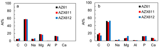 Atomic fraction of elements detected by EDS analysis on PEO coatings of AZ61, AZX611, and AZX612 specimens (a) before and (b) after 14 days immersion in SBF.