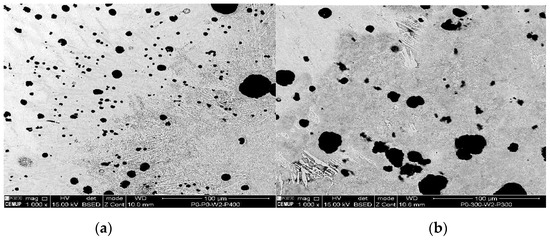 The tested samples that obtained the uppermost UTS values were chosen to be analyzed by metallography analysis. The sets of samples selected were: P0W2P400, P0W4P400, and P300W2P300. On the basis of the microscopic analysis some conclusions about the differences between the parent metal, HAZ, and filler metal were made. It also allowed differentiating metallographic structures formed after welding and after the heat treatments. Figure 4, Figure 5, Figure 6 and Figure 7 demonstrate the SEM analysis results of the selected samples. In Figure 4, with 500× magnification, it is possible to verify that the parent metal is located at the lower right-hand of the Figure 4a,b, while the filler metal is in the upper left-hand side of the images Figure 4a,b. In the diagonal, the HAZ and weld interface can be verified. In Figure 4a,b we observed that large nodules of graphite split themselves due to the thermal cycle and diffused them into the filler metal. This effect was also promoted by the filler metal used since this electrode can capture some of the existing carbon in the base material and precipitates it in the form of graphite. This happened mainly when two passes were used, because when four passes were performed, the filler metal does not reveal small nodules of graphite. Moreover, in the case of four passes, the HAZ is narrower and fainter. Figure 5 shows the boundary zone between parent metal and HAZ, using a SEM magnification of 1000×. In Figure 5a, it is possible to observe large needle-shape structures and small graphite nodules in the HAZ area. This image verifies the present of a gradual transition of the filler metal indicated by a slender band combined with the weld interface. In Figure 5b, a sudden interface transition is noticeable, as well as the carbon diffusion process which is illustrated by the carbon impoverishment surrounding the larger graphite nodules (light dyed circles). Figure 6c also illustrates the carbon diffusion process in the HAZ which is characterized by the small black circles in the image and the large dispersion of small-sized graphite spherulites in the HAZ area. In Figure 6a and Figure 7a, the presence of ledeburite (needle-shaped structures) and small amounts of martensite, especially in the HAZ and in the PMZ area, are shown.