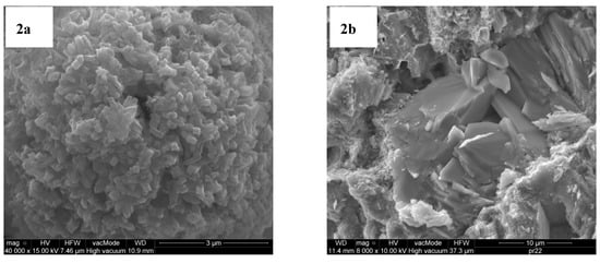 These materials represent two different structure topologies. Na-P1 is a synthetic zeolite obtained in the hydrothermal reaction converting the F-class fly ash and aqueous solution of sodium hydroxide. The pureness of the obtained product was about 70%. Na-P1 is a gismonde-like structure (GIS), which is built out of two four-membered rings forming an eight-membered channel of 3.1 × 4.5 Å and 2.8 × 4.8 Å. NaP1 zeolite forms fine plate-habit grains. Their maximum dimensions are 1 µm of length, 0.2 µm of width and 0.1 µm of thickness. Crystals of the Na-P1 zeolite create rosette-structure clusters (Figure 2a).
