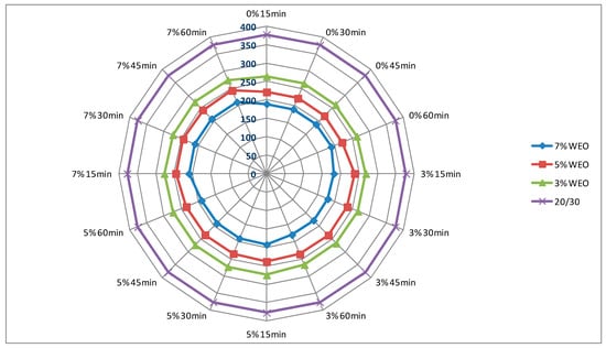 The results of dynamic viscosity tests for bitumens with the addition of the WEO and zeolites are presented in Figure 4, Figure 5, Figure 6 and Figure 7. The lines in Figure 4, Figure 5, Figure 6 and Figure 7 in the color green, red and blue determines the viscosity level of asphalt with the addition of WEO (according to the legend). The purple line determines the viscosity of the reference asphalt without additives. The % mark on the external outline of the charts (black font) is the percentage addition of the zeolite material in relation to the weight of the asphalt. The minute designation (black font) refers to the moment of viscosity measurement counted from the moment of specimen placement in the viscometer (Measurement time and percentage zeolite addition has been marked additionally on the first figure with the viscosity results—Figure 4). The viscosity value in the mPa·s unit is presented with a dark blue font.