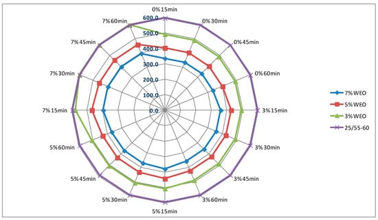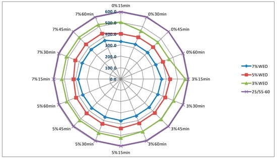 Similarly as in the bitumens foamed by the addition of zeolites and mesoporous materials, a decrease in viscosity over time was obtained for each combination of asphalt-zeolite-WEO [36,38]. The highest level of changes occurred after 30 min of the test (45 min after mixing asphalt with zeolite). After 45 min, the viscosity level stabilized. The reduction in asphalt viscosity over time was caused by a slow release of the zeolite water.