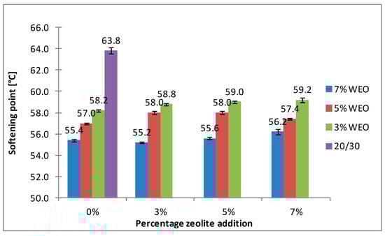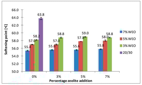 The results of softening point tests for the 20/30 asphalt with the addition of WEO and Na-P1 zeolite.