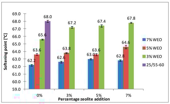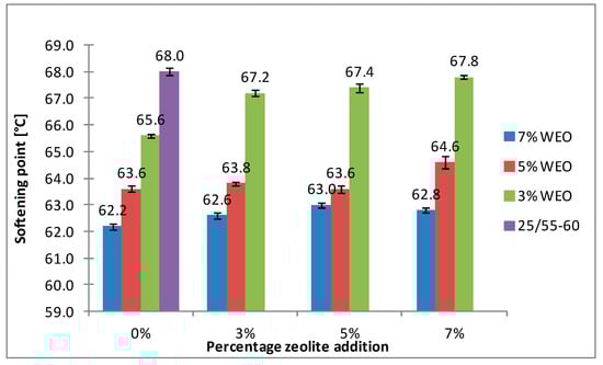 The results of softening point tests for the 25/55-60 asphalt with the addition of WEO and clinoptilolite zeolite.
