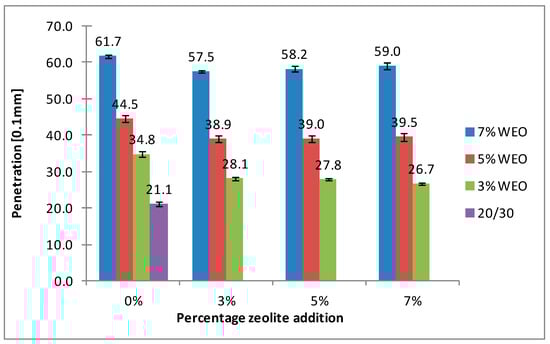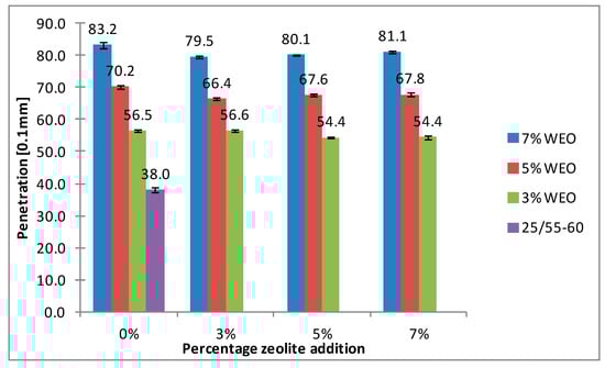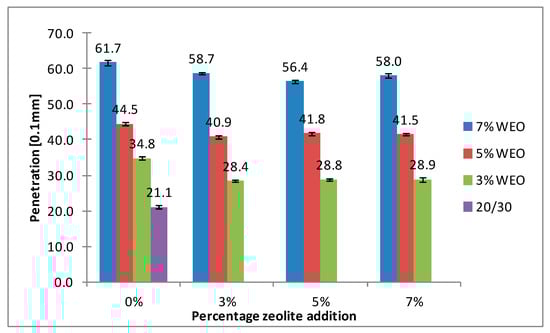 The results of penetration for bitumens with the addition of WEO and zeolites are presented in Figure 12, Figure 13, Figure 14 and Figure 15.