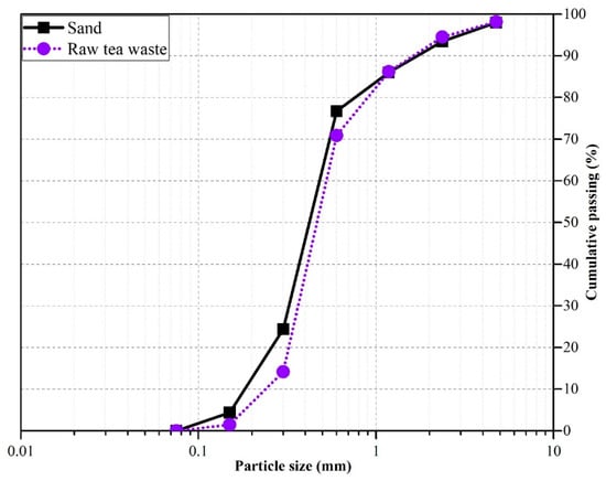 Ordinary Portland cement (OPC) meeting the requirements of ASTM C150 [] was used as the major binder, and natural river sand was used as the fine aggregate. The particles of natural river sand were passed through ASTM Sieve No. 4 and retained on ASTM Sieve No. 200. Black tea waste (obtained from domestic waste in local areas of Seoul) and perlite (obtained from the local market) particles were used as internal curing agents to store water inside the particles and minimize interior temperatures during hydration at early ages. Liquid-type superplasticizer (S.P) was used as a high-range water-reducing admixture. Mixes made with tea waste and perlite particles were labeled as TW and P, respectively. Two different size ranges were selected for both types of particles. Tea waste particles were labeled TW30 and TW50, respectively, whereas perlite particles were labeled P30 and P50, respectively. The number 30 indicates that the particles were passed through ASTM Sieve No. 4 and were retained on Sieve No. 30, whereas the number 50 indicates that the particles were passed through ASTM Sieve No. 30 and were retained on Sieve No. 50. The amount of tea waste and perlite particles added into mixes was 1% and 3% by volume of cement. The obtained physical properties of the sand, tea waste, and perlite are provided in Table 1, and gradation curves for sand and raw tea waste are shown in Figure 1.