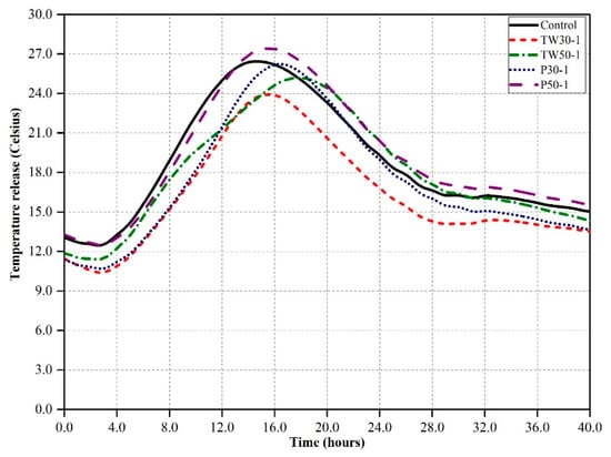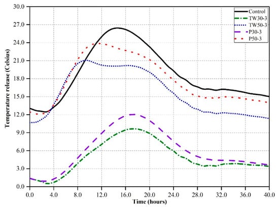 Figure 3 shows the heat release rates of five mixes (control, TW30-3, TW50-3, P30-3, and P50-3) that contained 3% tea waste (TW30 and TW50) and perlite (P30 and P50) particles by volume of cement over 40 h. Mixes TW30-3 and P30-3, which contained coarser particles of tea waste and perlite had very low temperatures of around 9 °C and 12 °C at 17 h, respectively. However, the temperature values of the other two mixes (TW50-3 and P50-3), which contained finer particles, were higher than those of the two mixes that contained coarser particles. The temperature values of TW50-3 and P50-3 were 21 °C and 24 °C at 10 h, respectively.