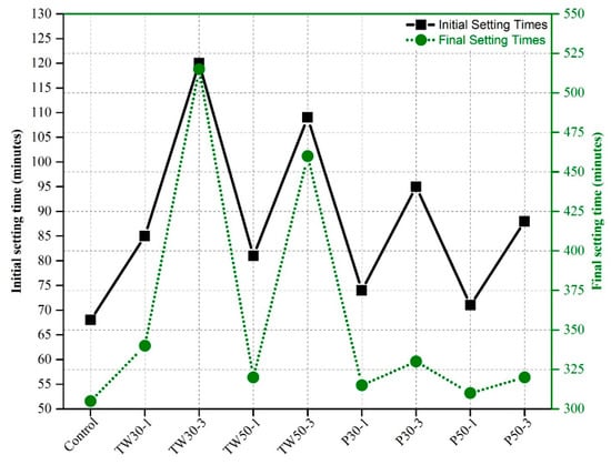 The setting times of all nine mixes (control, TW30-1, TW30-3, TW50-1, TW50-3, P30-1, P30-3, P50-1, and P50-3) are shown in Figure 4. The initial and final setting times of the control mix were 68 and 305 min, respectively. The initial and final setting times of the remaining eight mixes were 103 and 375 min, 215 and 940 min, 91 and 350 min, 200 and 460 min, 84 and 335 min, 115 and 401 min, 79 and 328 min, and 103 and 388 min, respectively.