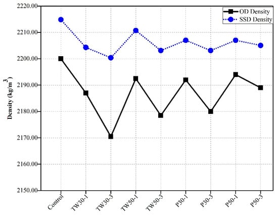 Figure 5 shows the OD and SSD densities of prismatic mortar specimens of all nine mixes. The OD and SSD densities of the control mix were 2200 kg/m3 and 2214.84 kg/m3, respectively. The OD and SSD densities of the remaining eight mixes (control, TW30-1, TW30-3, TW50-1, TW50-3, P30-1, P30-3, P50-1, and P50-3) were 2187.00 kg/m3 and 2204.30 kg/m3, 2170.50 kg/m3 and 2200.39 kg/m3, 2192.50 kg/m3 and 2210.79 kg/m3, 2178.50 kg/m3 and 2203.12 kg/m3, 2192.00 kg/m3 and 2207.07 kg/m3, 2180.00 kg/m3 and 2203.12 kg/m3, 2194.00 kg/m3 and 2207.03 kg/m3, and 2189.00 kg/m3 and 2205.08 kg/m3, respectively.