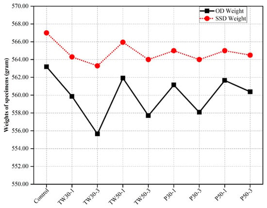 The weight and water absorption rate of prismatic mortar specimens are shown in Figure 6 and Figure 7. Figure 6 shows the average weights of all nine mixes (control, TW30-1, TW30-3, TW50-1, TW50-3, P30-1, P30-3, P50-1, and P50-3) under OD and SSD conditions. The average OD weights (WOD) and SSD weights (WSSD) of prismatic mortar specimens of the control mix were 563.20 g and 567.00 g, respectively. The average OD and SSD weights of the remaining eight mixes were 559.87 g and 564.30, 555.65 g and 563.30 g, 561.92 g and 565.95 g, 557.70 g and 564.0 g, 561.15 g and 565.00 g, 558.08 g and 564.00 g, 561.66 g and 565.00 g, and 560.38 g and 564.50 g, respectively.