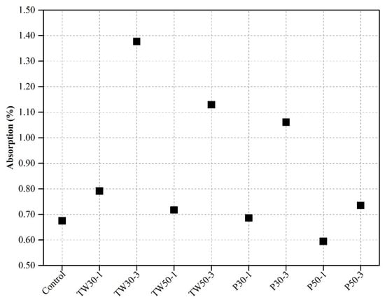 The absorption (%) of the control mix was observed to be 0.67%. The absorption values of the remaining eight mixes (TW30-1, TW30-3, TW50-1, TW50-3, P30-1, P30-3, P50-1, and P50-3) were 0.79%, 1.38%, 0.72%, 1.14%, 0.68% 1.07%, 0.59%, and 0.74%, respectively.
