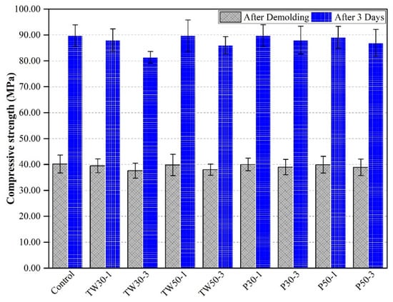 The average compressive strengths of all mix specimens after demolding and curing in water for three days are shown in Figure 8. The compressive strengths of the control mix after demolding and curing in water for three days were 40.20 MPa and 89.76 MPa, respectively. The compressive strengths of the remaining eight mixes (TW30-1, TW30-3, TW50-1, TW50-3, P30-1, P30-3, P50-1, and P50-3) were 39.50 MPa and 88.00 MPa, 37.60 MPa and 81.40 MPa, 39.80 MPa and 89.70 MPa, 38.00 MPa and 86.00 MPa, 40.00 and 89.74 MPa, 39.00 MPa and 88.00 MPa, 39.90 MPa and 89.05 MPa, and 38.90 MPa and 86.90 MPa, respectively.