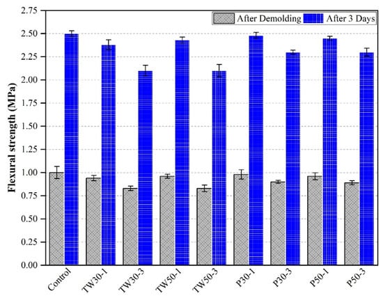 The flexural strengths of all prismatic mortar specimens after demolding and curing in water for three days are shown in Figure 9. The control mix had flexural strengths of 1.0 MPa and 2.5 MPa after demolding and curing in water for three days, respectively. The flexural strengths of TW30-1, TW30-3, TW50-1, TW50-3, P30-1, P30-3, P50-1, and P50-3 after demolding and curing in water for three days were 0.94 MPa and 2.38 MPa, 0.83 MPa and 2.10 MPa, 0.96 MPa and 2.43 MPa, 0.83 MPa and 2.10 MPa, 0.98 MPa and 2.48 MPa, 0.90 MPa and 2.30 MPa, 0.96 MPa and 2.45 MPa, and 0.89 MPa and 2.30 MPa, respectively.