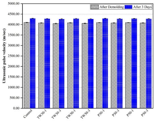 Ultrasonic pulse velocity (UPV) results for all prismatic mortar specimens after demolding and curing in water for three days are shown in Figure 10. The control mix had velocities of 3600 m/s and 4300 m/s after demolding and curing, respectively. The remaining eight mixes had slightly lower velocity values than the control mix. The UPV of the remaining eight mixes (TW30-1, TW30-3, TW50-1, TW50-3, P30-1, P30-3, P50-1, and P50-3) were 3560 m/s and 4285 m/s, 3500 m/s and 4270 m/s, 3574 m/s and 4289 m/s, 3520 m/s and 4275 m/s, 3591 m/s and 4291 m/s, 3550 m/s and 4280 m/s, 3596 m/s and 4293 m/s, and 3555 m/s and 4281 m/s, respectively. The addition of tea waste and perlite particles reduced the velocities of the specimens. This reduction might be due to the presence of porous ICAs. The effect of porosity may vanish over time when complete hydration occurs and a denser microstructure forms.