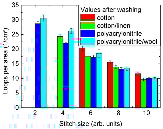 Numbers of loops per area, measured after washing using microscopic images of areas (11 mm × 15 mm). The stitch sizes are given by the machine definition, ranging from 1–10. The resulting structural parameters of the knitted fabrics can be found below.