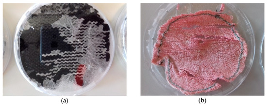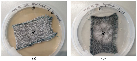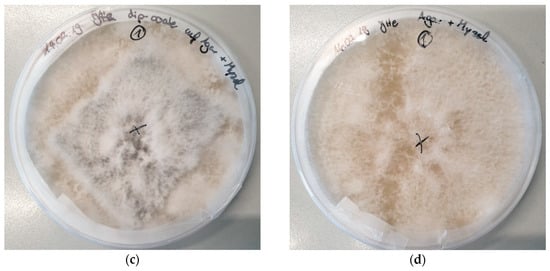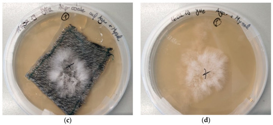 It is clearly visible that the mycelium grows thickest on pure agar (Figure 3d) as well as on the combination with a dip-coated fabric on an agar plate (Figure 3c), while the pure fabric on the agar plate results in only weak growth. This shows that dip-coating the fabric with agar is essential to promote mycelium growth, the opposite of former tests with nanofiber mats [] in which it was sufficient to place the textile substrates on agar plates. Here, however, the relatively thick knitted fabrics prevent the mycelium from reaching the agar plate below and thus disturb the growth process as long as they are not soaked with agar themselves.