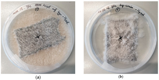 Mycelium after finished experiments: (a) rear side of cotton fabric before drying; (b) dried acrylic/wool sample.