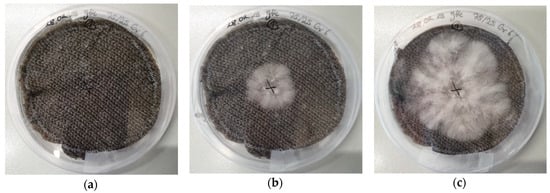 It is clearly visible that mycelium growth is slowest on the pure fabric placed on an agar plate (Figure 2a) which can be attributed to the reduced contact between the liquid mycelium culture and the agar. The other three cases show a significantly stronger growth, mostly on an approximately circular area as seen on nanofiber mats [] but also with extensions from this expected area, most probably due to undesired flowing of the initial drop of liquid mycelium culture from the position marked by an “x.”