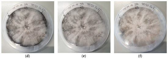 In all cases, the substrates were completely covered with mycelium after 11–12 days. Figure 3 depicts photographic images of the samples shown in Figure 2 after 12 days.