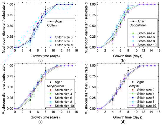 To examine the influence of the stitch dimensions, Figure 5 shows the growth processes on the different textile substrates under examination. During the first few days, that is, in the so-called lag phase, the mycelium adapts to the new substrates on which it was inoculated and does not grow []. In the subsequent exponential (or log) phase, the fastest growth occurs. Finally, this phase is stopped, often by the depletion of nutrients in the medium, here by the borders of the knitted fabrics.