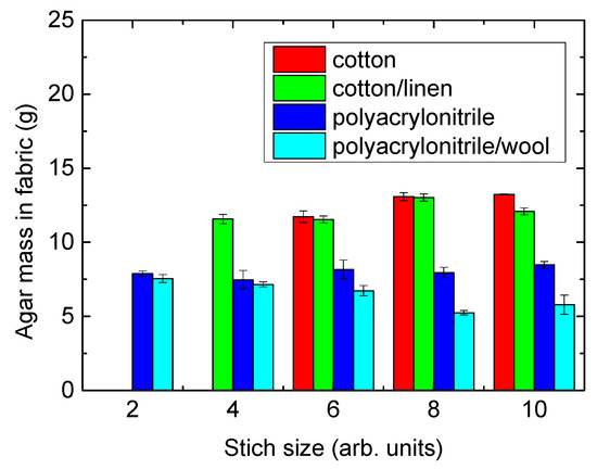 Here it is clearly visible that cotton and cotton/linen always absorb significantly more agar than acrylic or acrylic/wool. On the other hand, the amount of agar in the acrylic/wool fabrics decreases with the stitch size. This finding suggests future experiments with other knitted structures, such as plush, to create highly absorbing acrylic-based knitted fabrics which enable long growth processes without the necessity of using the textile structure as an additional nutrient.