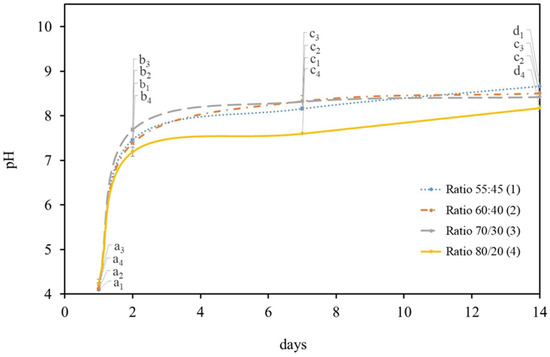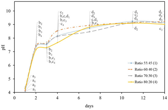 The statistical analysis was performed for each day in each of the tested symbiotic media ratio. It found that the pH values of 60:40 symbiotic media ratio were statistically different on the first three days, which reveals a well individualized increase of pH and a stabilization (from the 7th day) to a pH value adjacent to 9.