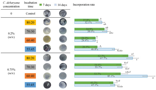 Symbiotic biofilms obtained to the different HS:BG-11 media ratios during 7 and 14 incubation days, and the C. debaryana incorporation rate. Values in the same column that do not share a common superscript are significantly different (p < 0.05).