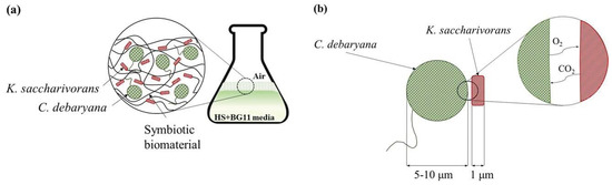 Illustration of (a) symbiotic biofilm formation by K. saccharivorans and C. debaryana in HS:BG-11 culture media and (b) CO2 and O2 transfer between C. debaryana and K. saccharivorans.