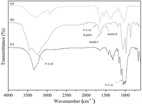 ATR-FTIR spectra of (a) microalgae C. debaryana, (b) biofilm produced by symbiotic growth of K. saccharivorans and C. debaryana and (c) regular BC produced by K. saccharivorans.