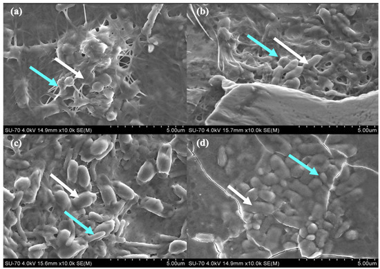 SEM micrograph of symbiotic biofilms produced by bacteria K. saccharivorans (blue arrow) and microalgae C. debaryana presence (white arrow), at 30 °C after 14 day incubation, in different HS:BG-11 symbiotic media ratio: (a) 55:45; (b) 60:40; (c) 70:30; and (d) 80:20.