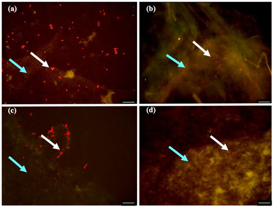 Fluorescence micrographs showing the viability of C. debaryana cells (white arrow) immobilized in biofilms (blue arrow) produced at 30 °C and after 14 day of incubation, in different HS:BG-11symbiotic media ratios: (a) 55:45; (b) 60:40; (c) 70:30 and (d) 80:20. Scale bar, 100 μm.